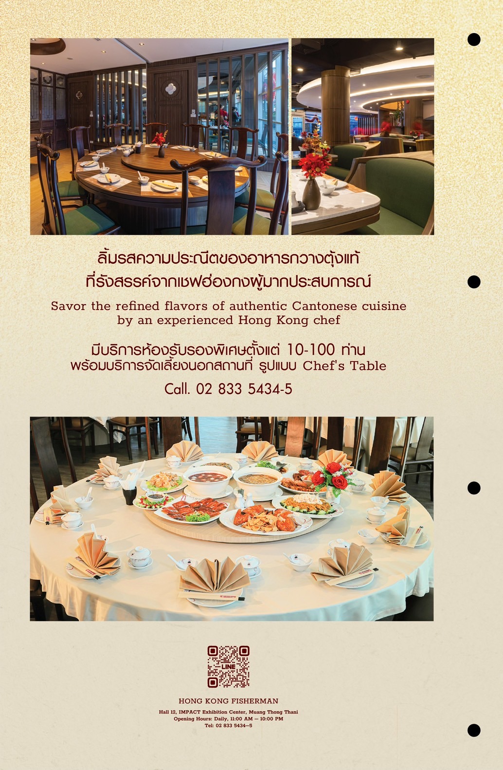 Hong Kong restaurant chain under management of IMPACT Exhibition Management Co., Ltd., the operator of Thailand’s No. 1 exhibition and convention center IMPACT Muang Thong Thani, enables customers in Thailand to experience the true flavors of authentic Hong Kong style Chinese food without having to travel to Hong Kong. Each restaurant in the Hong Kong chain has its own style and uniqueness. Hong Kong Fisherman specializes in Cantonese cuisine, offering a wide array of delightful culinary delicacies with more than 200 menu items and 50 kinds of dim sum as well as freshly made and delicious Hong Kong style dessert. The restaurant is decorated in modern Chinese style inspired by the Old Shanghai period. However, the menu items offered are exactly the same as IMPACT Branch.